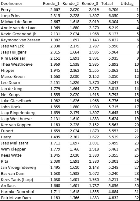 Nadat alle uitslagen briefjes waren ingeleverd en gecontroleerd kon de uitslag bekend worden gemaakt. Op de eerste plaats eindigde Ferry met een punten totaal van 6.706. Als tweede eindigde Joep met een punten totaal van 6.350 en vlak daar achter op de derde plaats Michael die 6.304 punten liet noteren.
